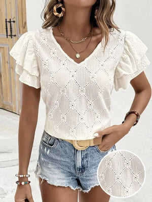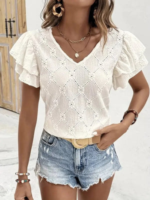 Låt sommaren bli ännu mer stilfull med denna vita blus med hålbroderi. Med sitt eleganta diamantmönster och mjuka fjärilsärmar är den skapad för att ge dig en fräsch och romantisk look – perfekt för både vardag och semester.