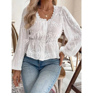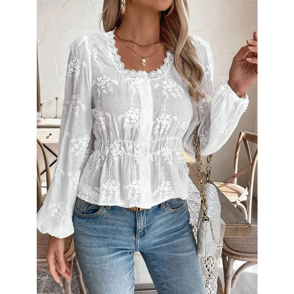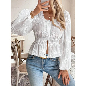 Vit broderad blus i broderie anglaise med ballongärm – romantisk elegans för sommaren