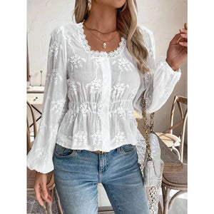 Låt din stil tala med denna vita broderade blus i broderie anglaise. Med sina luftiga ballongärmar och vackra broderade detaljer blir den det perfekta plagget för en feminin och chic look under sommarens ljusa dagar.