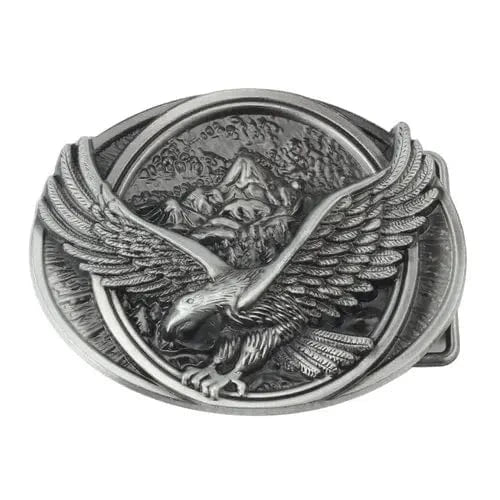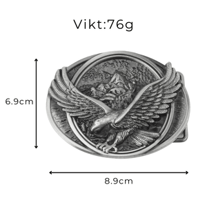 Fånga kraften i frihetens symbol – örnen – med detta västerninspirerade bältesspänne. Den majestätiska fågeln sträcker ut sina vingar över bergstopparna och ger din look en dramatisk och ikonisk touch.