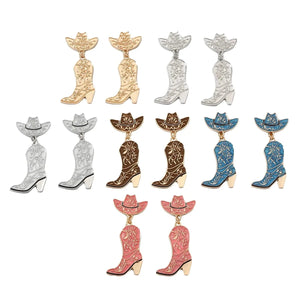 Sätt pricken över i:et på din outfit med dessa färgstarka western boot örhängen. Den ikoniska cowboyhatten och stöveln i miniatyr hänger tillsammans i en charmig design som ger dig både festlig attityd och vardaglig lekfullhet. Perfekta för allt från bachelorette-fester till countrykonserter.