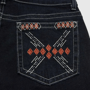 Detaljerade mönster vid fickor och längs benet som andas personlig stil och tradition. -