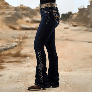 Omfamna den moderna cowgirl-stilen med våra western broderade mörkblå bootcut jeans – en hyllning till hantverk, frihet och kurvig elegans. Dessa jeans är skapade för att bäras med boots, hållning och självförtroende.