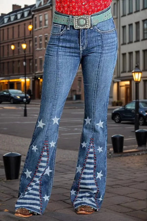 Ge din vardagslook en lekfull twist med våra western jeans dam – en utsvängd modell med stjärnapplikationer och kontrastpaneler som andas frihet och självförtroende.