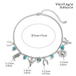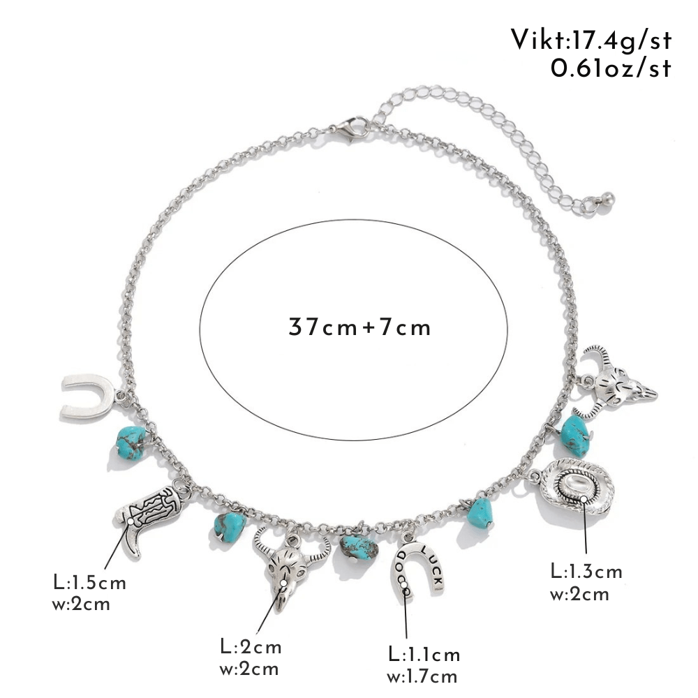 Lyft din outfit till nästa nivå med detta unika western-inspirerade smyckesset. Kombinationen av silverfärgade berlocker och turkosa stenar fångar både den vilda västerns charm och en modern boho-anda.