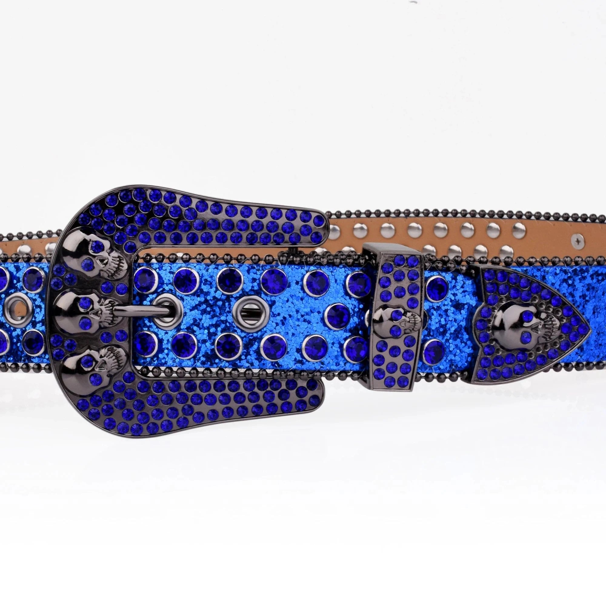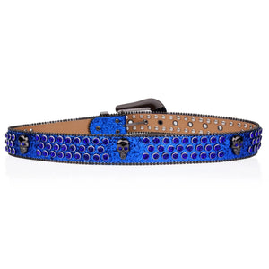 Det här är bältet för dig som inte vill smälta in. Med ett elektriskt blått glitterläder, dramatiska dödskalle-detaljer och skinande blå strass, är detta westernbältet som förvandlar varje outfit till en powerlook. En vågad accessoar för dig som lever med stil och attityd.