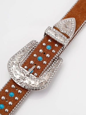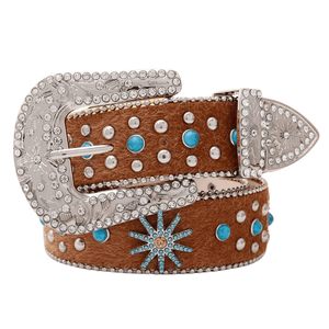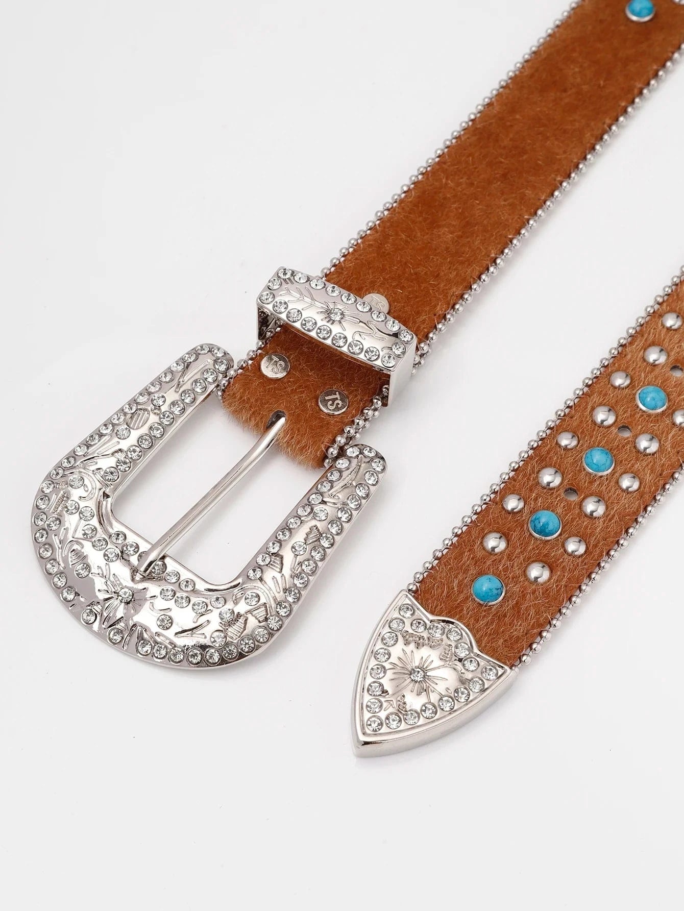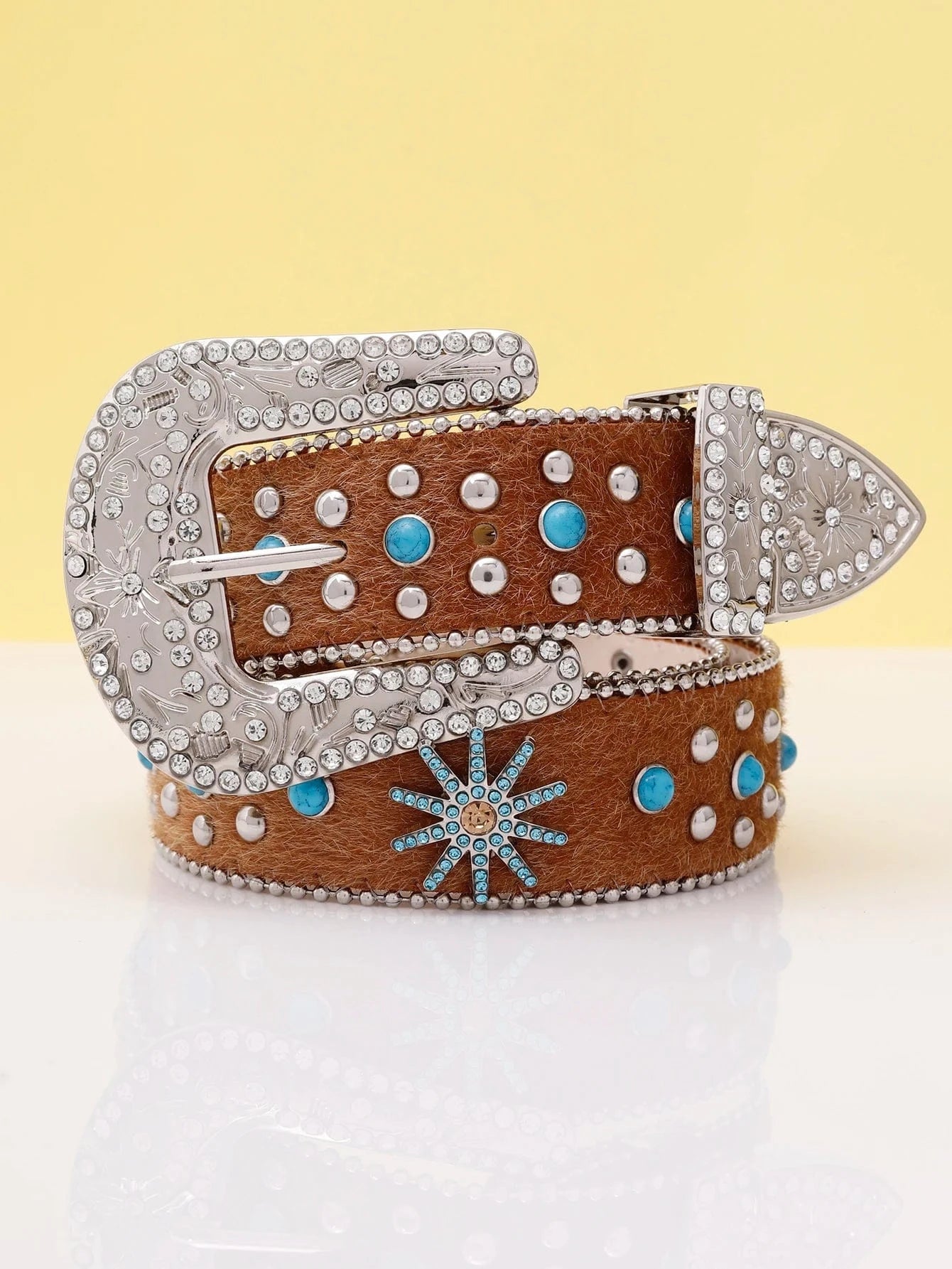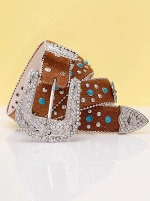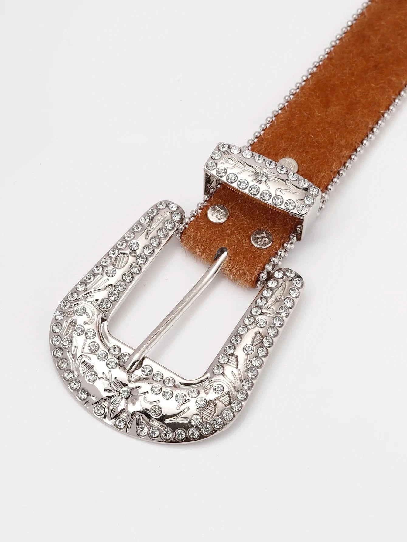 Ett bälte som är lika självsäkert som du. Med gnistrande strasstenar, dekorativt silverspänne och brunt konstläder med lätt pälsstruktur, sätter detta westernbälte tonen för en look som är både modig och feminin.