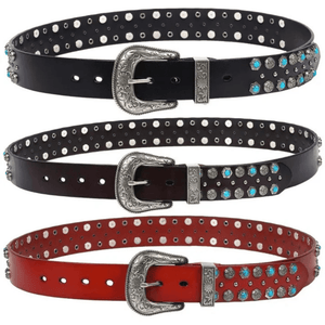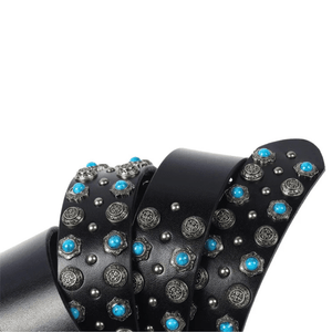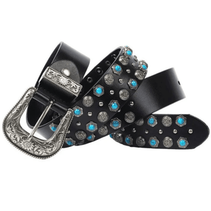 Det här är inte bara ett bälte – det är en stilmarkör. Med nitar, glittrande stenar och ett hantverksmässigt uttryck, förvandlar detta westernbälte varje outfit till något personligt.