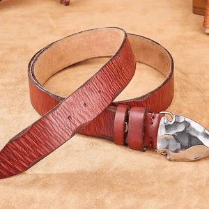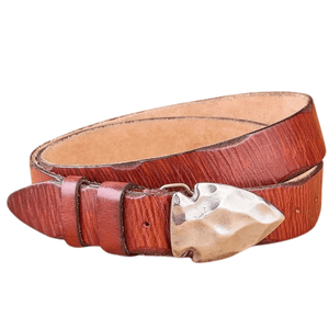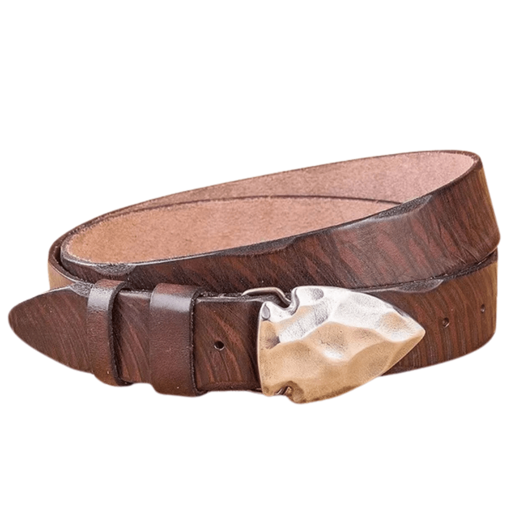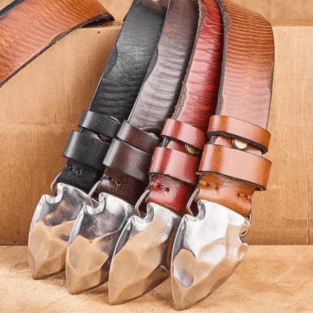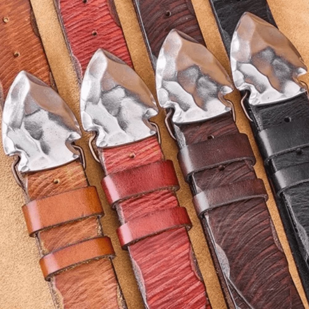 Letar du efter ett bälte som verkligen sticker ut? Det här westernbältet i kraftigt kohudsläder kombinerar klassisk westernkänsla med ett distinkt pilformat metallspänne. Välj mellan fyra naturliga färger – brun, coffee, rödbrun och svart – för att spegla din personlighet och stil.