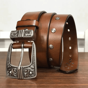 Det här är bältet som fångar ögat. Med robust design, rejäla nitar och ett utsmyckat spänne, förvandlar det vilken outfit som helst till ett statement. Oavsett om du bär jeans, boots eller skinnjacka – det här westernbältet är gjort för dig som vågar sticka ut.
