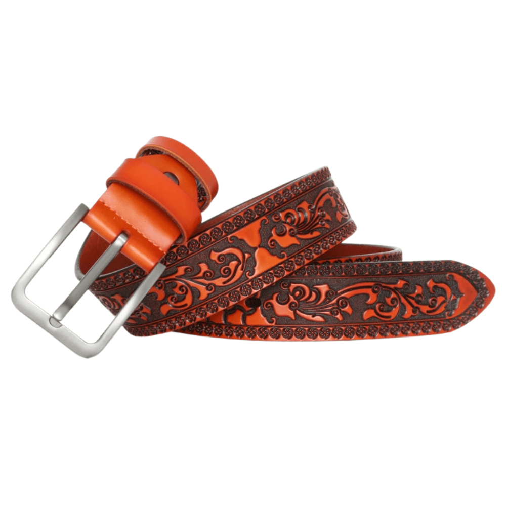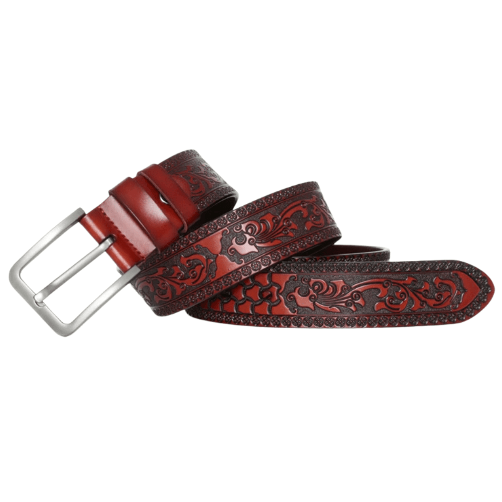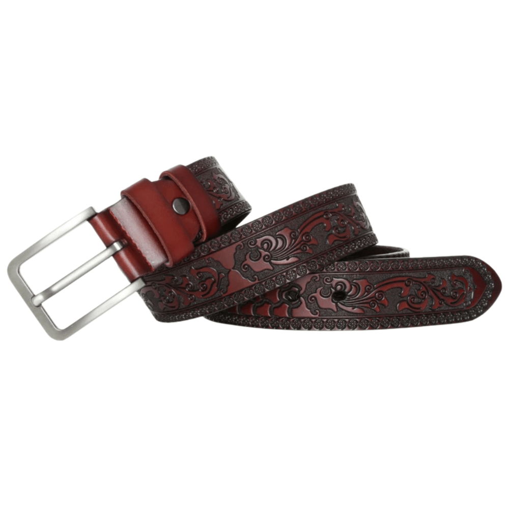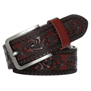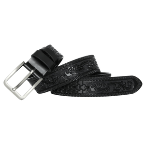 Här möts form och funktion i ett bälte som bär både tradition och modernitet. Med ett djuppräglat blommönster, slitstarkt läder och ett klassiskt metallspänne blir detta westernbälte en självklar följeslagare till dina jeans, chinos eller mockajacka.