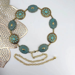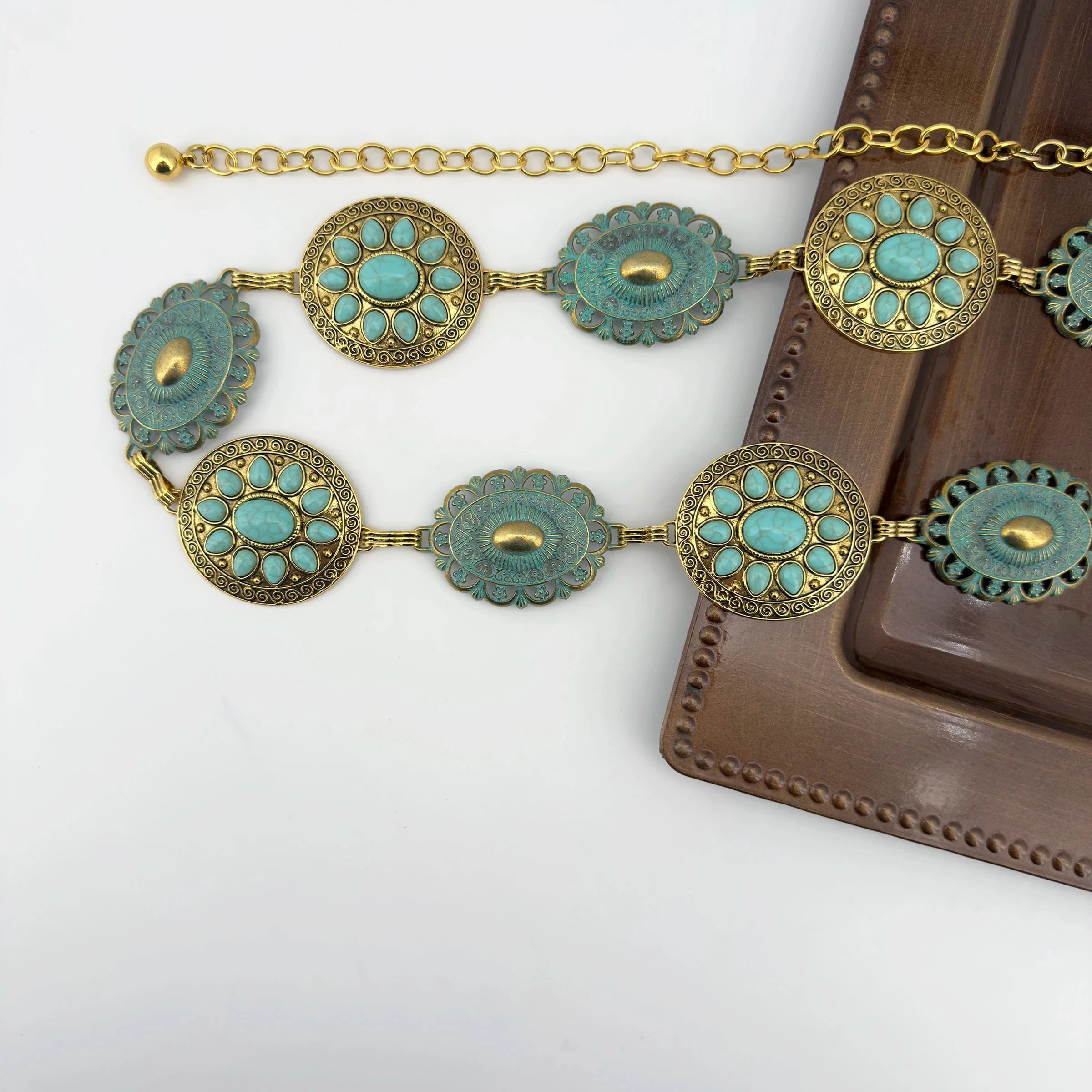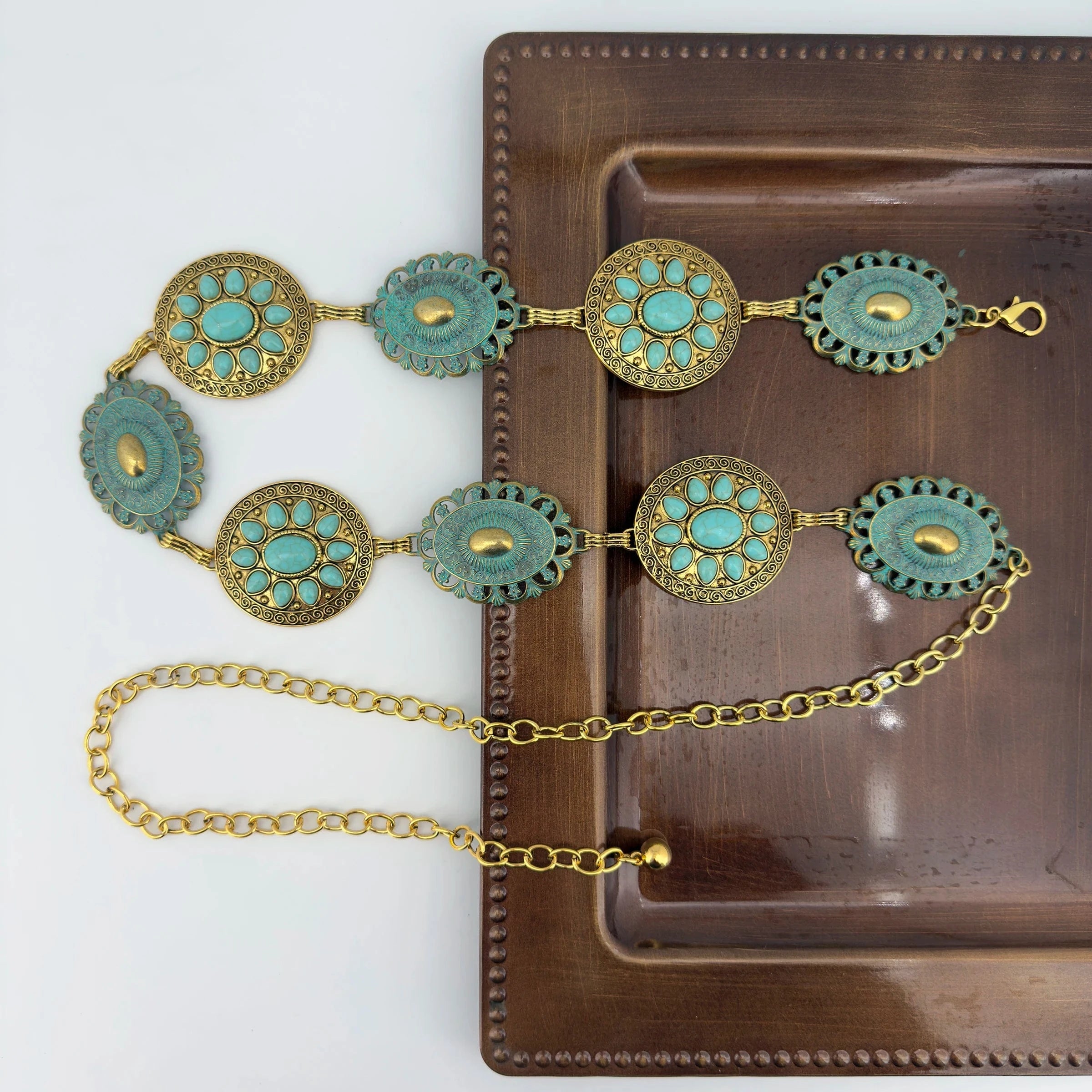 Mönstrade metallplattor i antik guldfinish och turkosa stenar skapar ett vintageinspirerat smycke. -