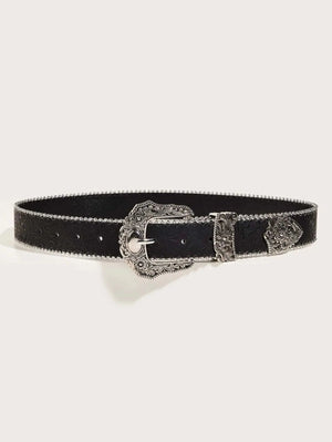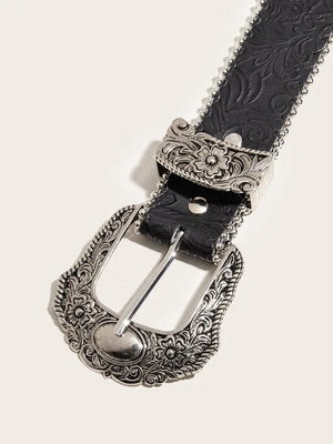 Upptäck ett westerninspirerat bälte i PU-läder som förenar vardaglig användning med elegant detaljrikedom. Med sitt dekorativa metallspänne blir det en självklar stilikon i din garderob.