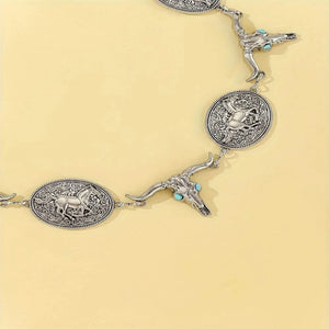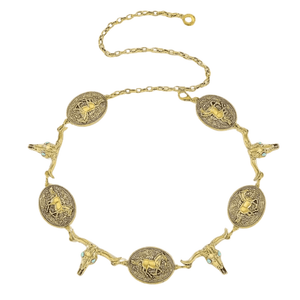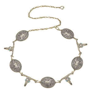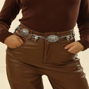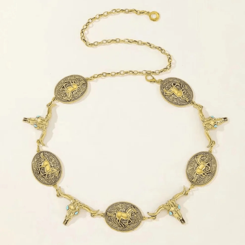 Lyft varje outfit med detta unika westernbälte i metall, designat för kvinnor som älskar att sticka ut. Med sina detaljerade häst- och tjurmotiv är det ett smycke i sig – lika mycket accessoar som statement.