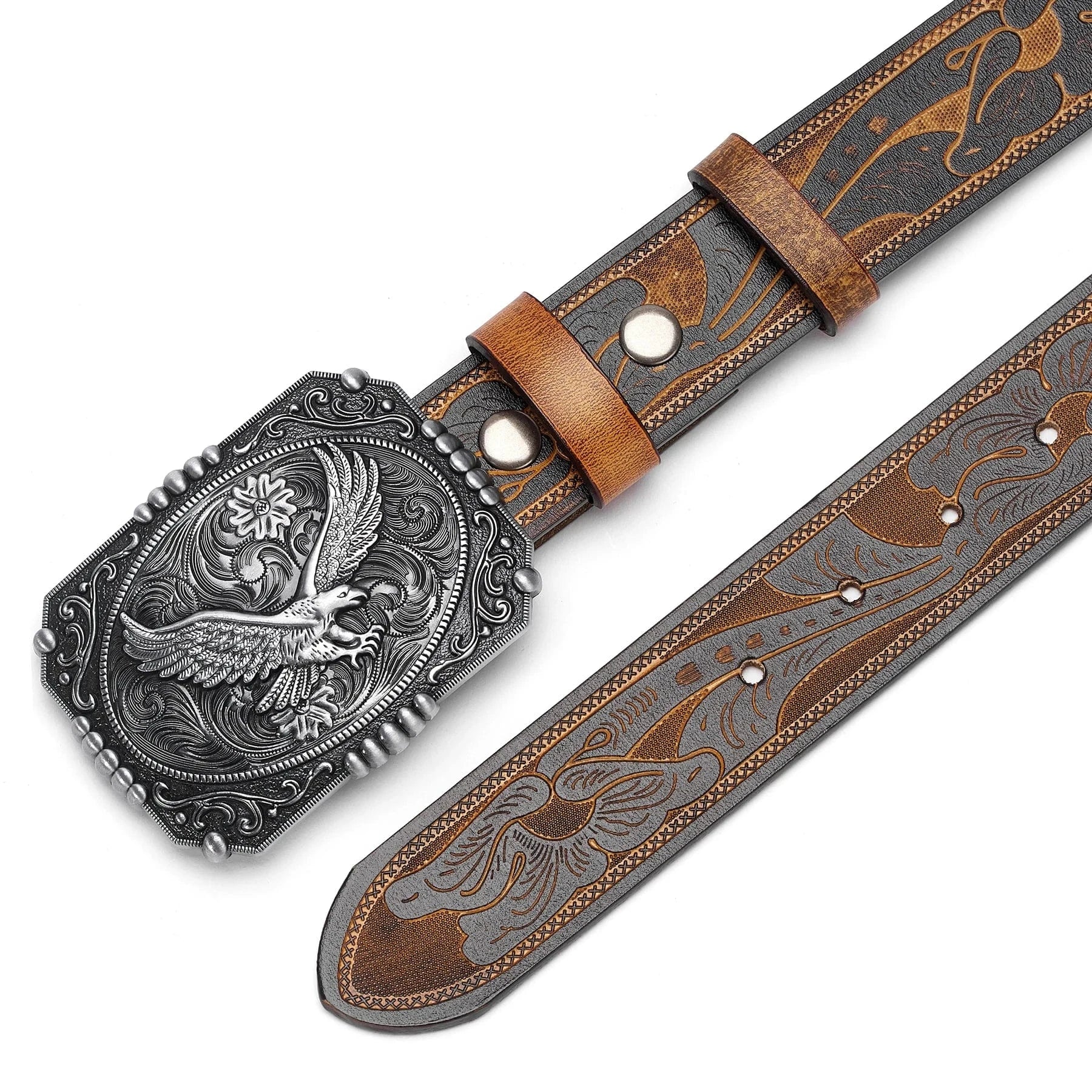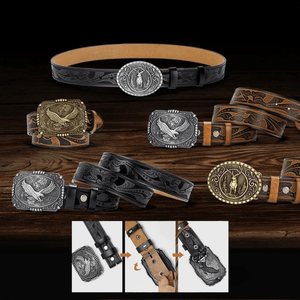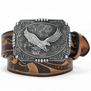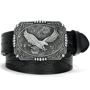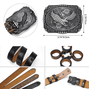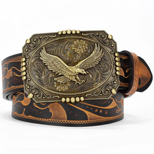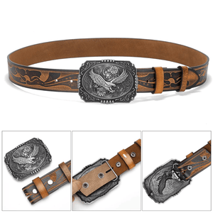 Detta westernbälte i präglat läder med ett iögonfallande örnspänne kombinerar klassisk cowboyattityd med förstklassigt hantverk. Bältet är skapat för dig som vill uttrycka stil och styrka – varje dag.