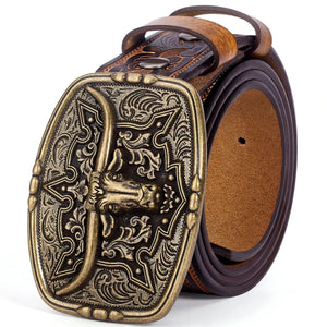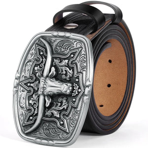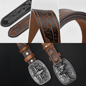 Det här är mer än bara ett bälte – det är en symbol. Med handpräglat mönster, kraftfullt oxhuvudspänne och äkta kohud blir detta westernbälte en självklar detalj i din vardagsstil och vid särskilda tillfällen.