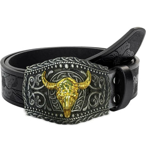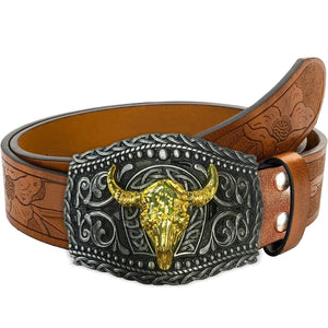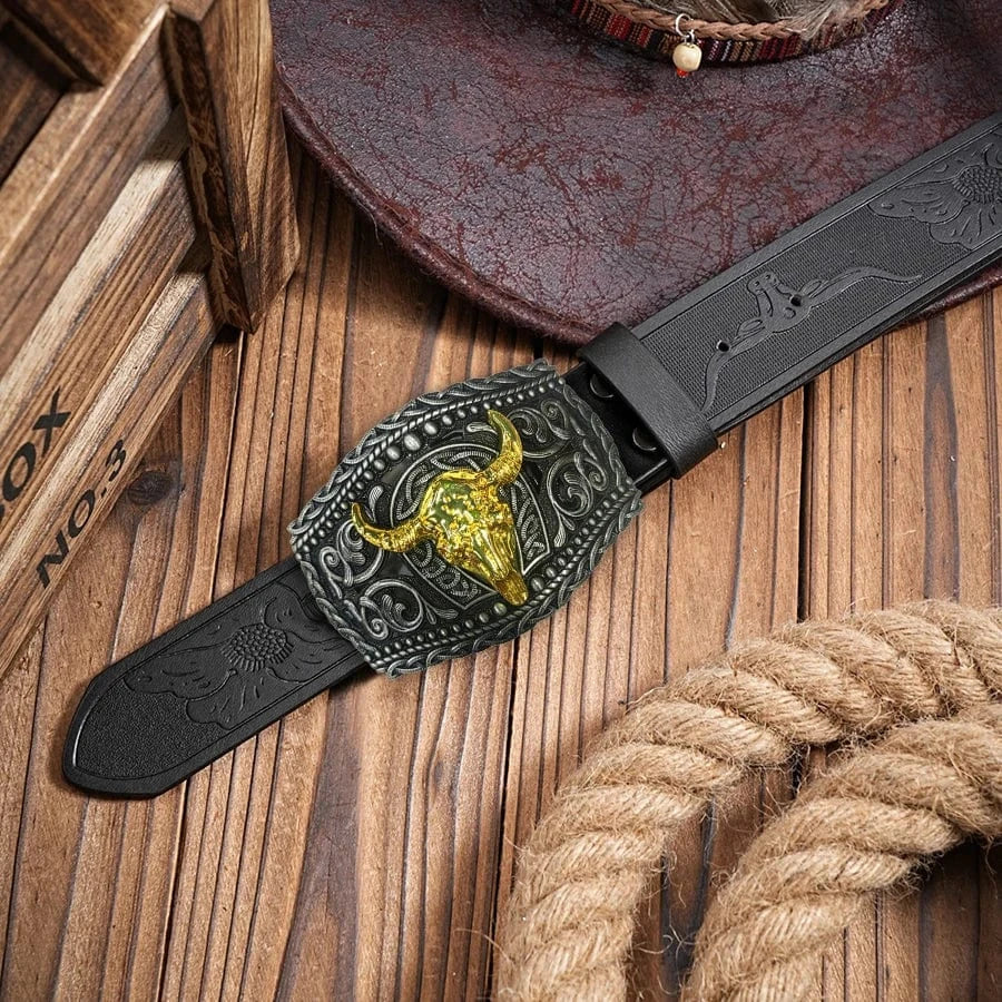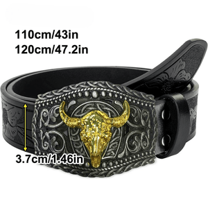 Det här bältet kombinerar klassisk cowboyanda med modern detaljrikedom. En prägling i PU-läder och ett guldfärgat tjurhuvud på spännet ger en stil som sticker ut – perfekt för dig som vill visa karaktär.