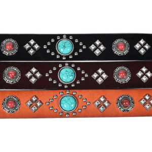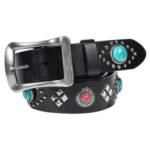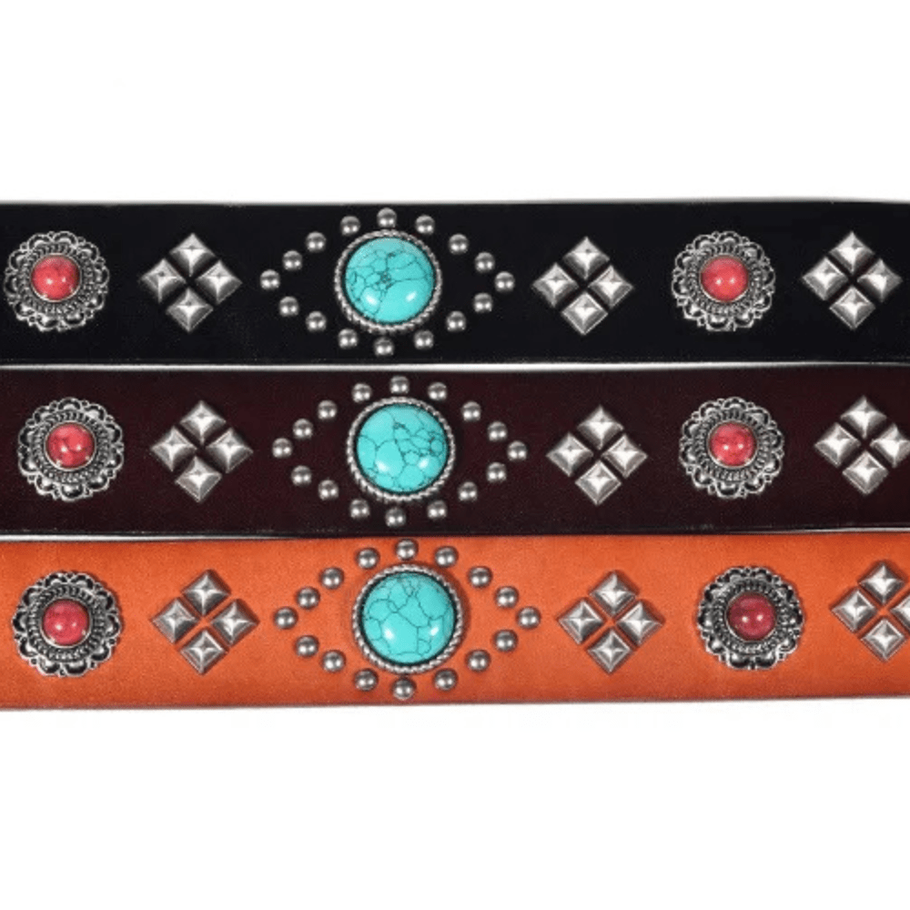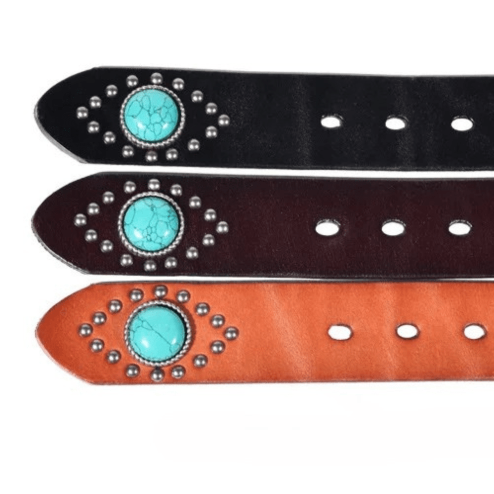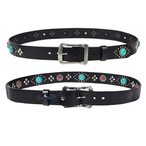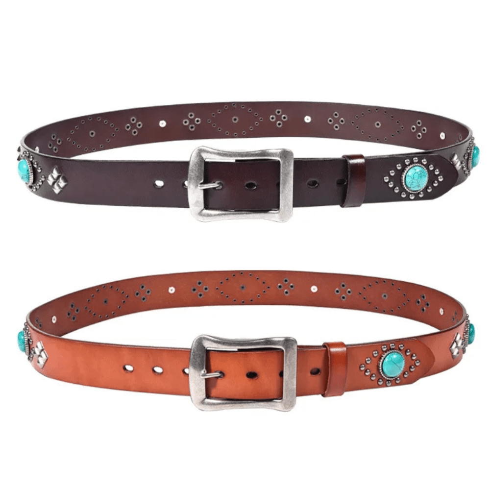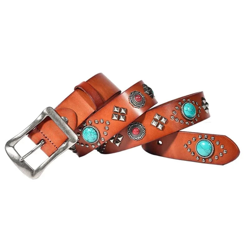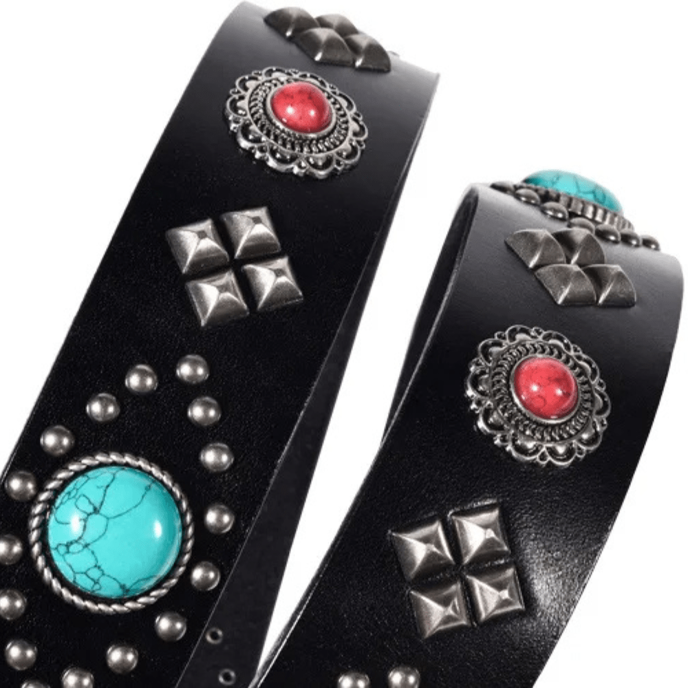 - Detaljer som sticker ut – turkosa stenar och metallnitar ger bältet karaktär