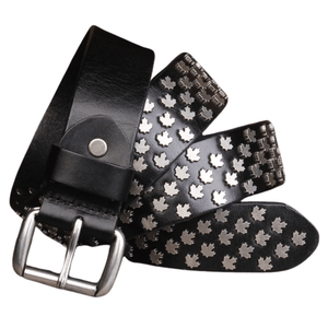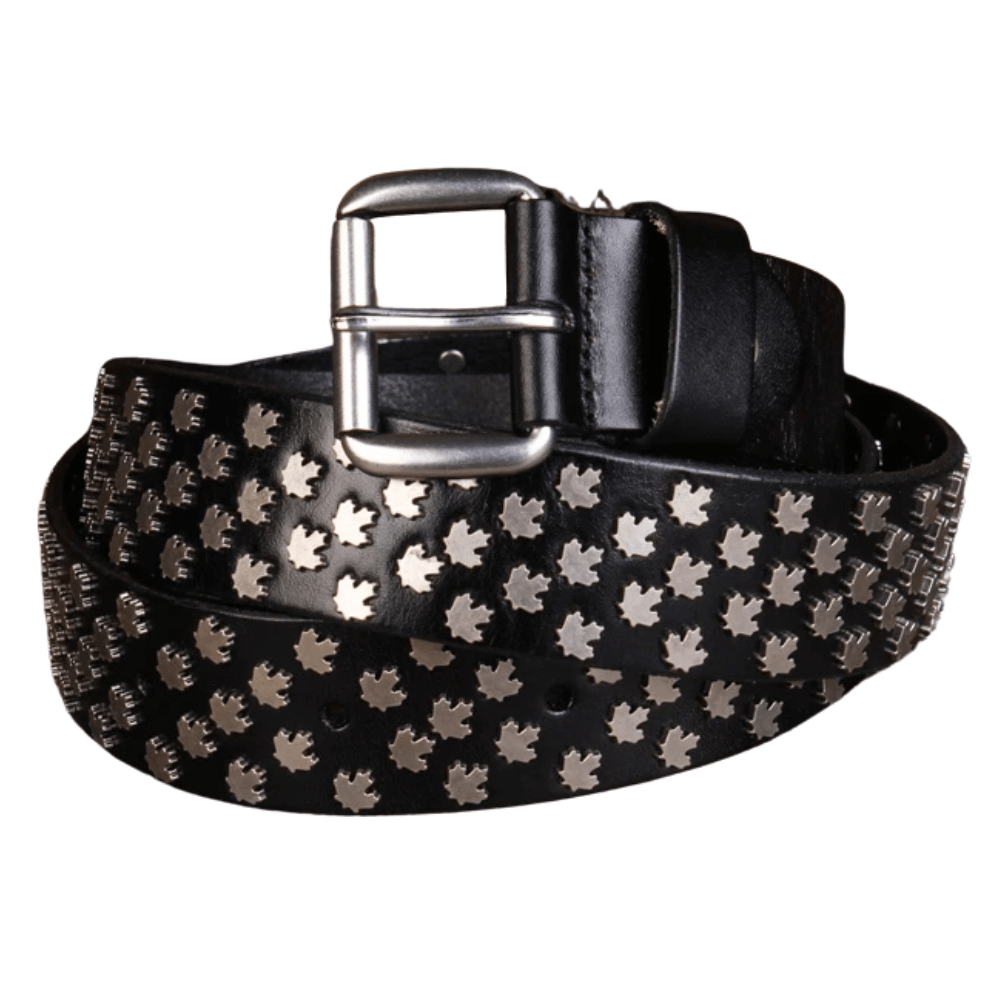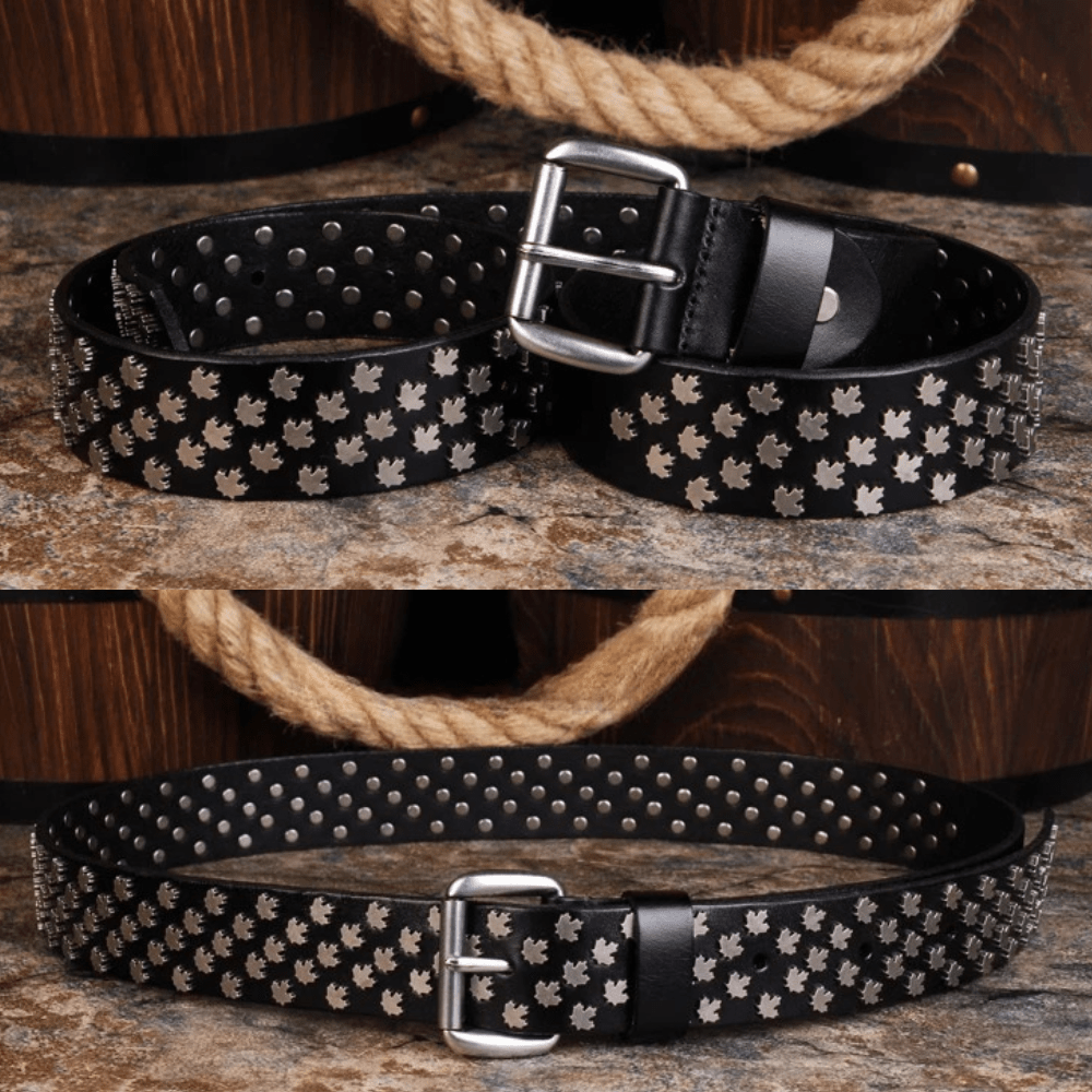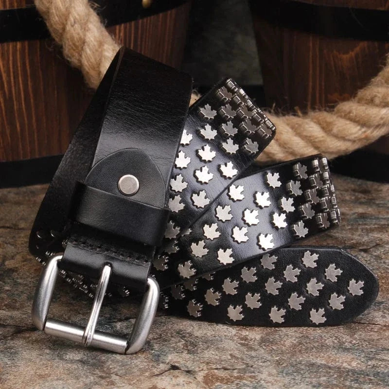 Det här bältet är allt annat än vanligt. En fusion av rustik westernvibe och modern punkenergi, klädd i högkvalitativt läder och prydd med nitar i form av lönnlöv.