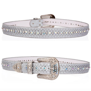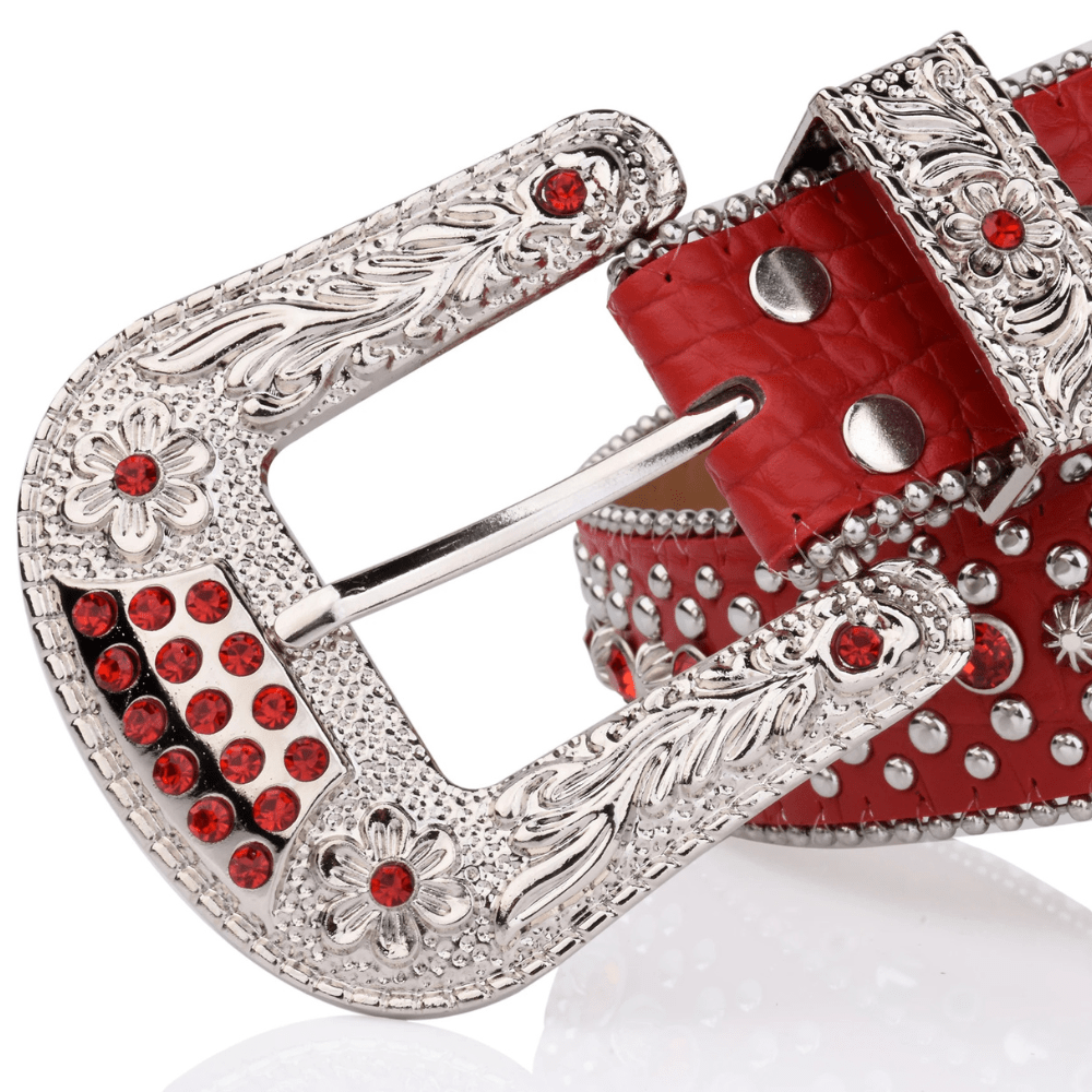 - Spänne: Graverat metallspänne med nitar och rhinestones