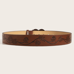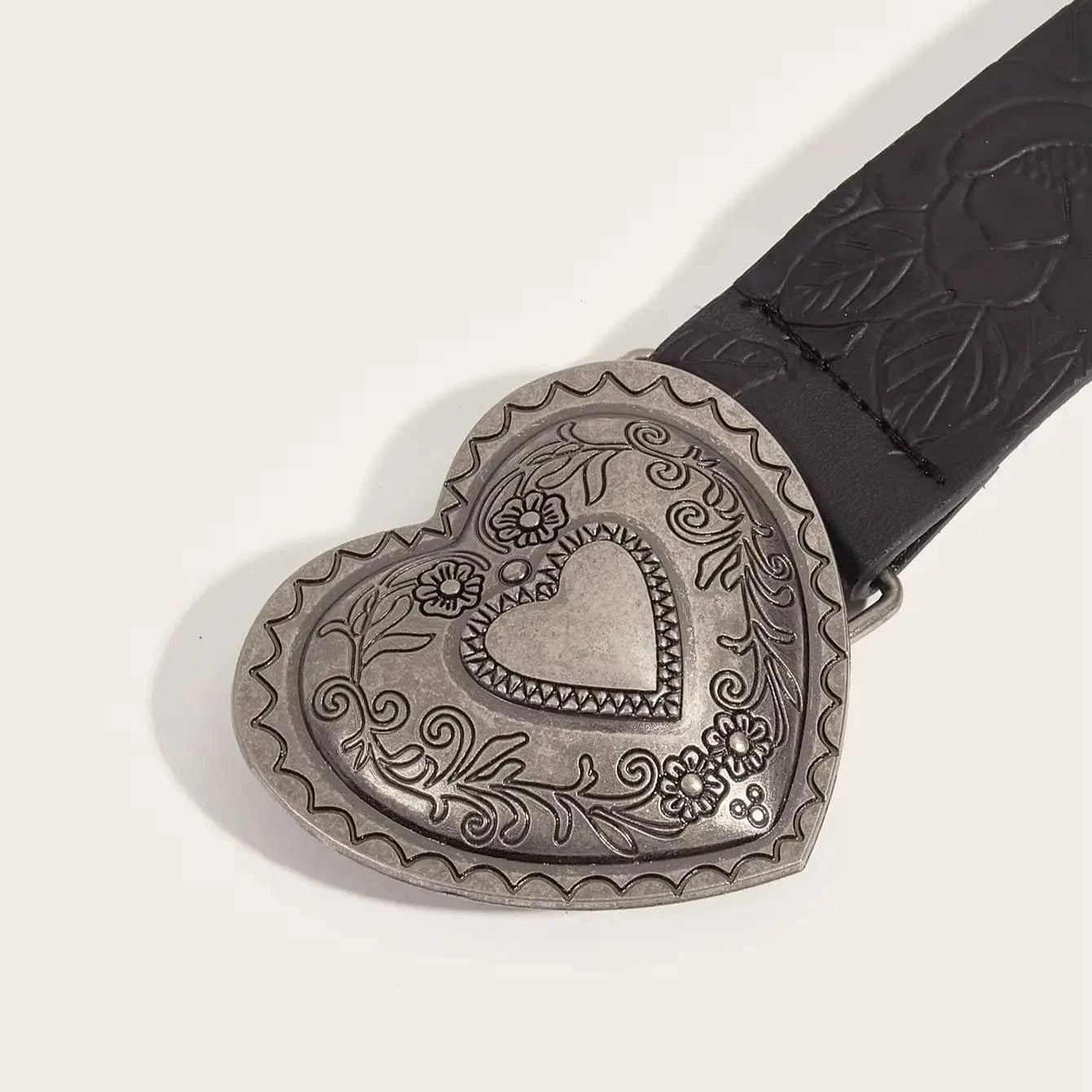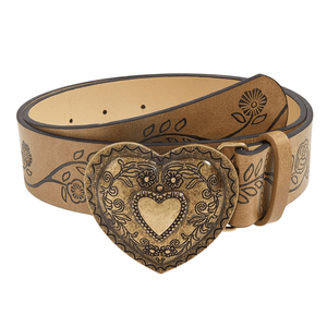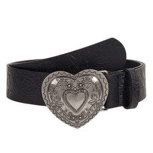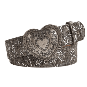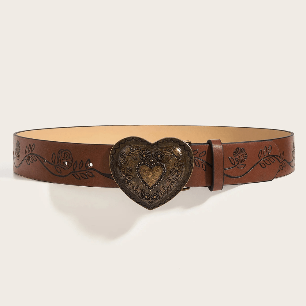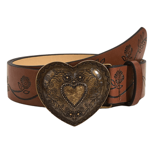 Ett unikt westernbälte som kombinerar rustik charm med mjuka feminina detaljer. Hjärtformat spänne i antikmetall möter blommigt präglat läder – perfekt för dig som vill sticka ut på kontoret eller under helgens äventyr.