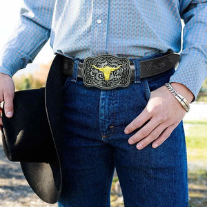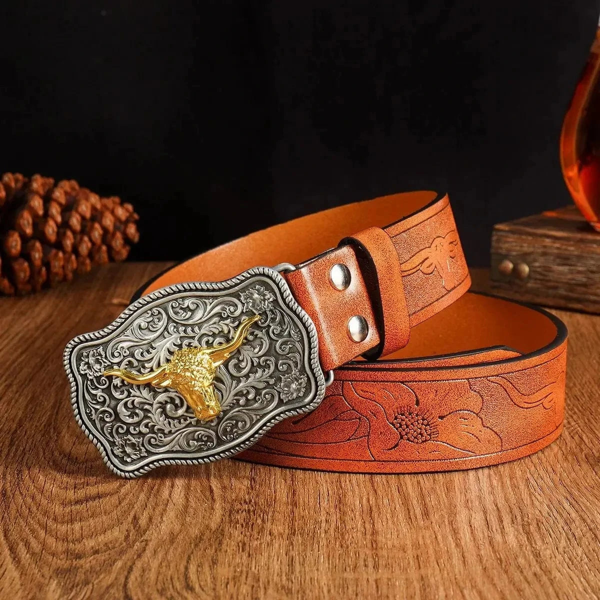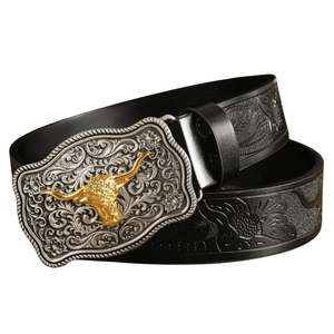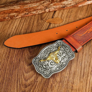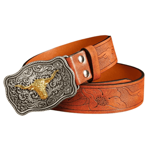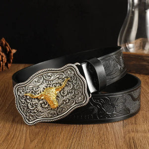 Westernbälte med präglat mönster och tjurhuvudspänne