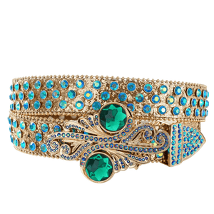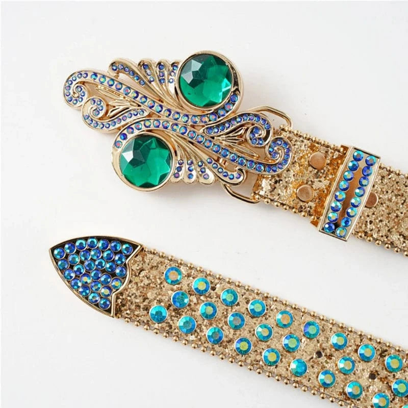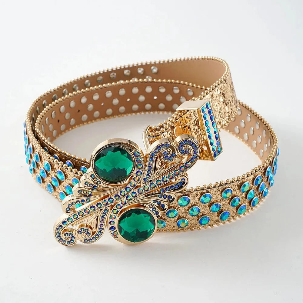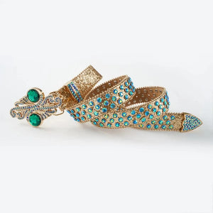 Gör entré med ett bälte som inte kompromissar. Det här westernbältet är för dig som gillar maximalism, uttryck och individualitet. Med blänkande strass, silvernitar och ett ikoniskt dödskallespänne med färgstarka fjädrar är det en accessoar som lyfter varje outfit – från festival till vardag.