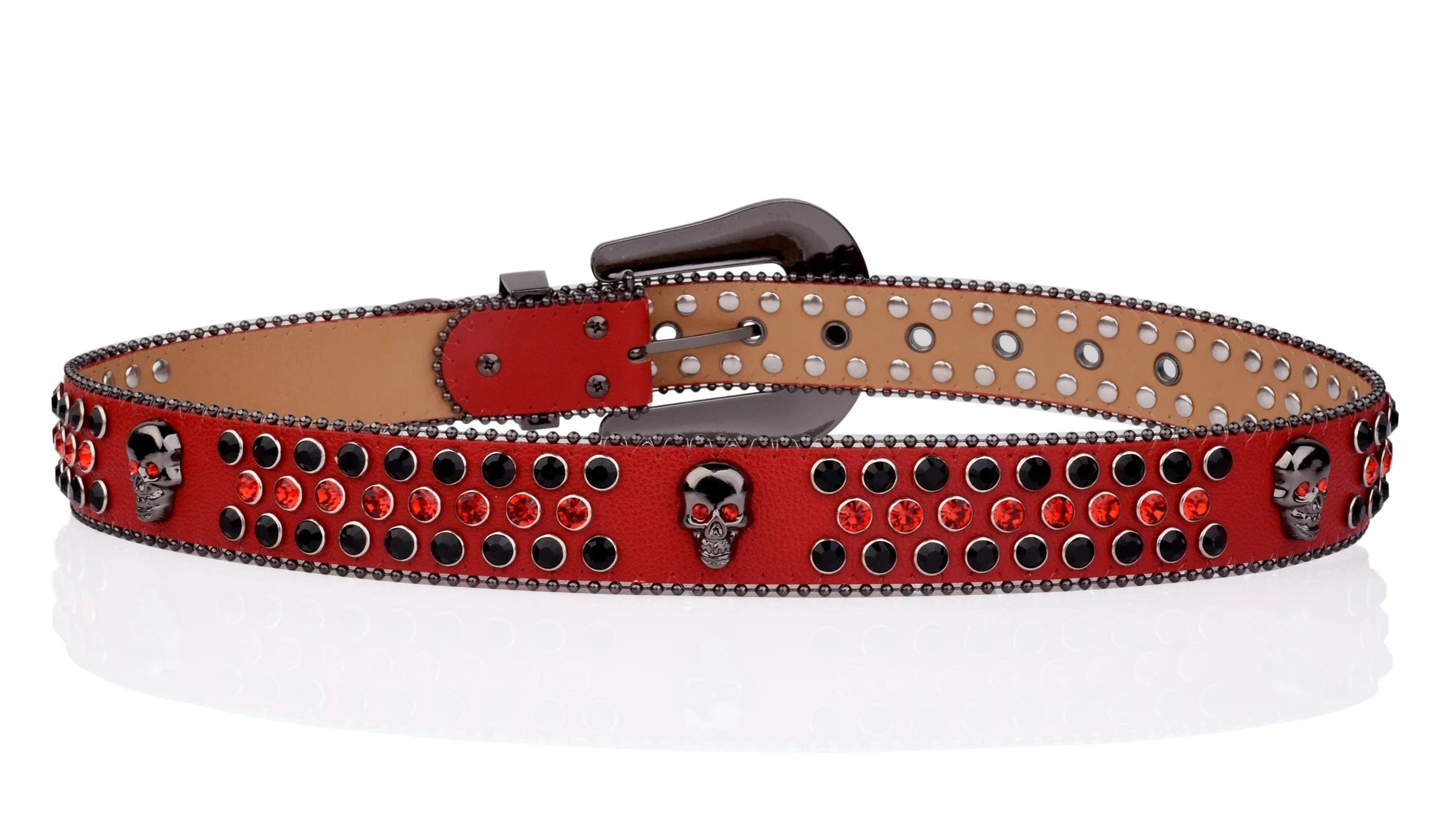 Det här är mer än ett bälte. Det är din attityd, din röst och din power. Ett punkigt westernbälte med eldröd bas, svarta och röda strassdetaljer samt ikoniska dödskallemotiv. För dig som klär dig med självsäkerhet och gillar att dominera scenen – vare sig det är gatan, klubben eller livet.