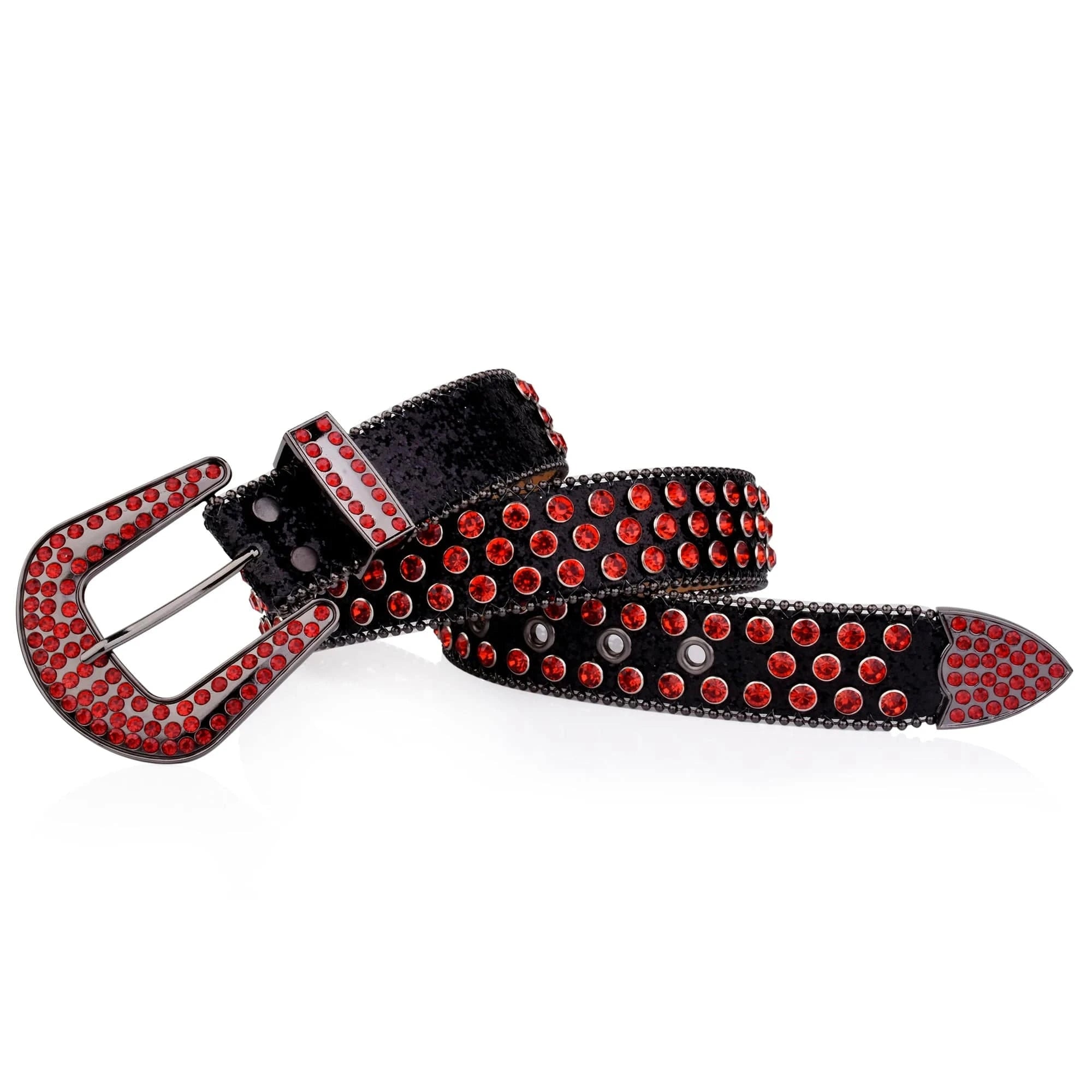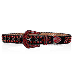 Det här är inte bara ett bälte – det är ett uttryck. Med intensivt röda strass över hela ytan, en glittrande spänne och ett stadigt hantverk i konstläder är detta westernbältet för dig som vågar stå i centrum – dag som natt.