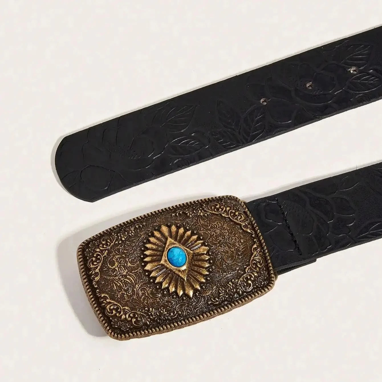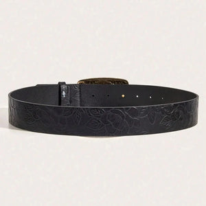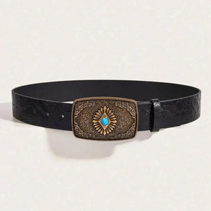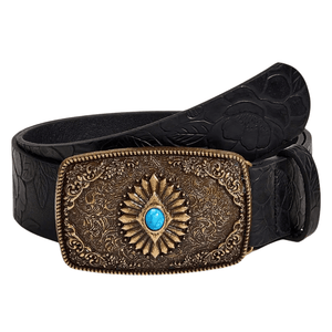 En tidlös accessoar med karaktär: detta westernbälte för kvinnor kombinerar svart präglad läderlook med ett utsmyckat rektangulärt spänne och en gnistrande safirblå detalj.