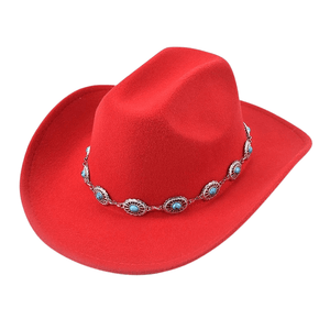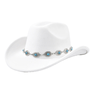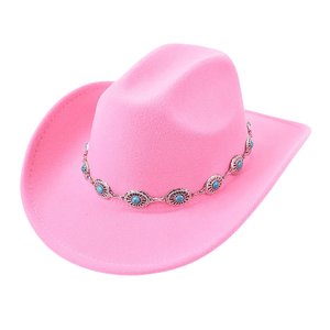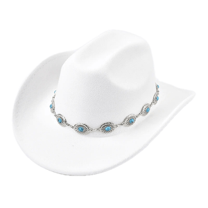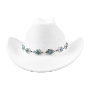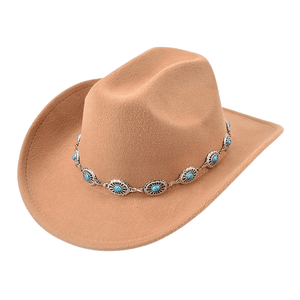 Denna hatt kombinerar klassisk form med en turkosdekorerad hattrem som fångar ljuset och ger din outfit en autentisk touch av westernlyx.