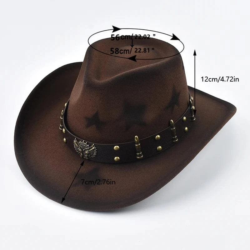 Sätt kronan på din look med vår Westernhatt med Stjärnmotiv – en hyllning till den klassiska cowboyandan med en modern twist. Denna hatt kombinerar karaktär, komfort och elegans i ett tidlöst uttryck som passar lika bra på festivaler som på vardagliga utflykter. Med sina distinkta stjärnor och dekorativa detaljer utstrålar den både självsäkerhet och charm.