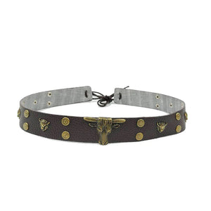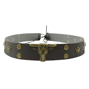 Ge din westernstil en kraftfull och autentisk touch med detta hattband prytt med ett antikt tjurhuvud i metall. Den mörkbruna strukturerade ytan, detaljerad med mässingsfärgade nitar och ornament, skapar en rustik men elegant känsla som lyfter varje cowboyhatt till nästa nivå. Perfekt för dig som vill uttrycka personlighet, styrka och en tidlös westernanda.